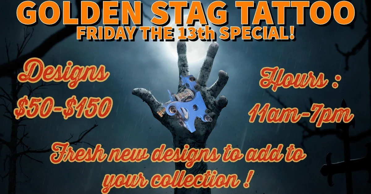 Hello Golden Stag fam! We are having our annual Wanderfest tattoo special April 27th from 10am-7pm. Custom flash designs will be offered from $50 to $150. First come first served.